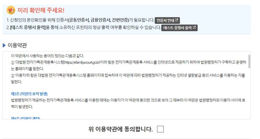 ③ 이용약관 동의 후 개인정보 입력 후 인증 진행 전자가족관계등록시스템의 경우 홈페이지 로그인 없이 공동·금융증명서 또는 간단한 인증을 통해 간단한 본인확인 후 발급이 가능한 것이 장점입니다.