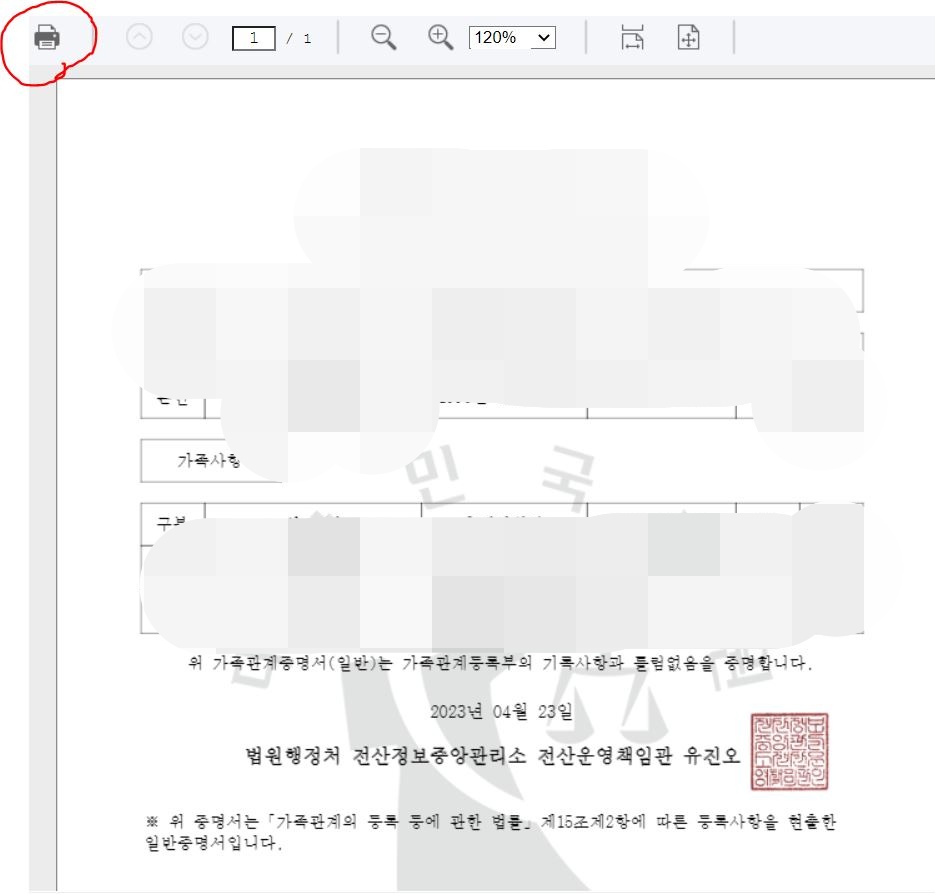 ⑤ 가족 관계 인증서를 확인하고 프린터 메뉴를 선택합니다