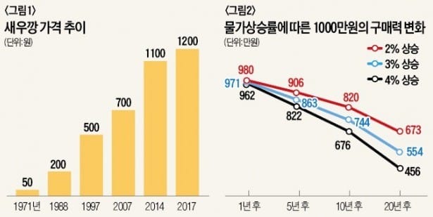 <그림2> 에서 볼 수 있듯이 인플레이션으로 인한 돈의 가치가 점점 하락하고 있기 때문입니다