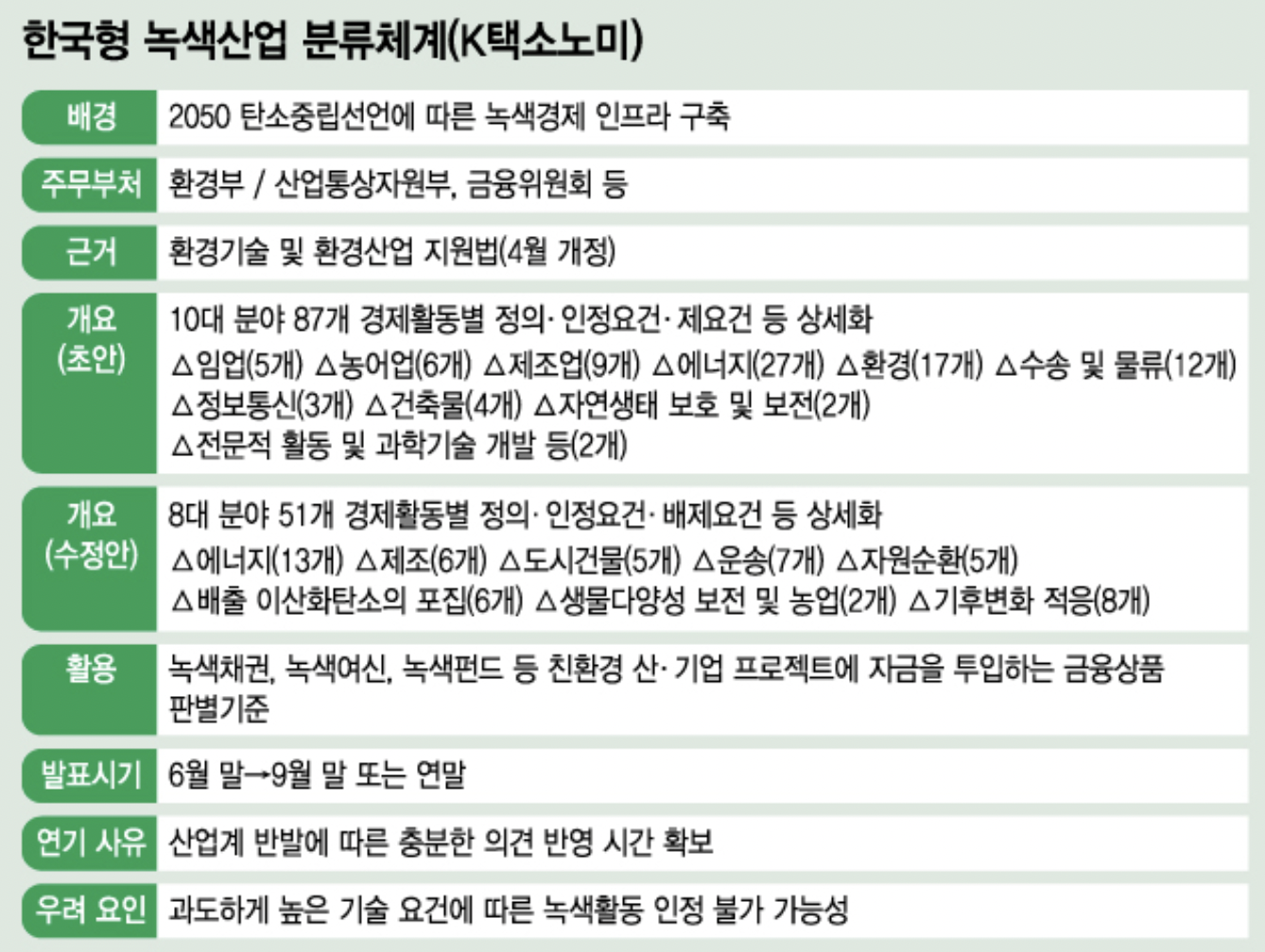 정부가 원자력 발전 정책을 친환경적인 경제 활동을 촉진하는 것을 공식적으로 발표하였다. 환경부는 원자력 발전소를 포함한 한국형 녹색분류체계(K-Taxonomy) 개정 녹색 분류 시스템은 20일에 공개했다. 경제 활동이 환경 친화적인지 여부를 규제하는 것 국가 표준 녹색 투자 상이 녹색 투자에 수여됩니다. 그것은 선택의 기준이기 때문에 특히 중요하다. 예를 들어, 현재 시범 프로젝트에 참여하고 있습니다. 은행은 녹색 분류 시스템에 포함됩니다. 경제 활동에 저리 융자를 하다 정부는 원자력 발전소를 포함한다. 녹색분류체계의 개정을 발표하면서, 그 논쟁은 다시 커질 것으로 예상된다.